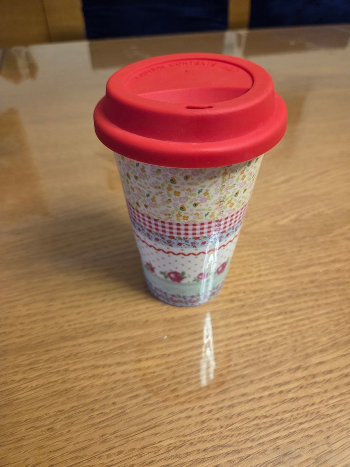 Kırmızı kapaklı, çiçek ve kareli desenli renkli kupa Pürüzsüz yüzeyde taşınabilir tasarım. ☕