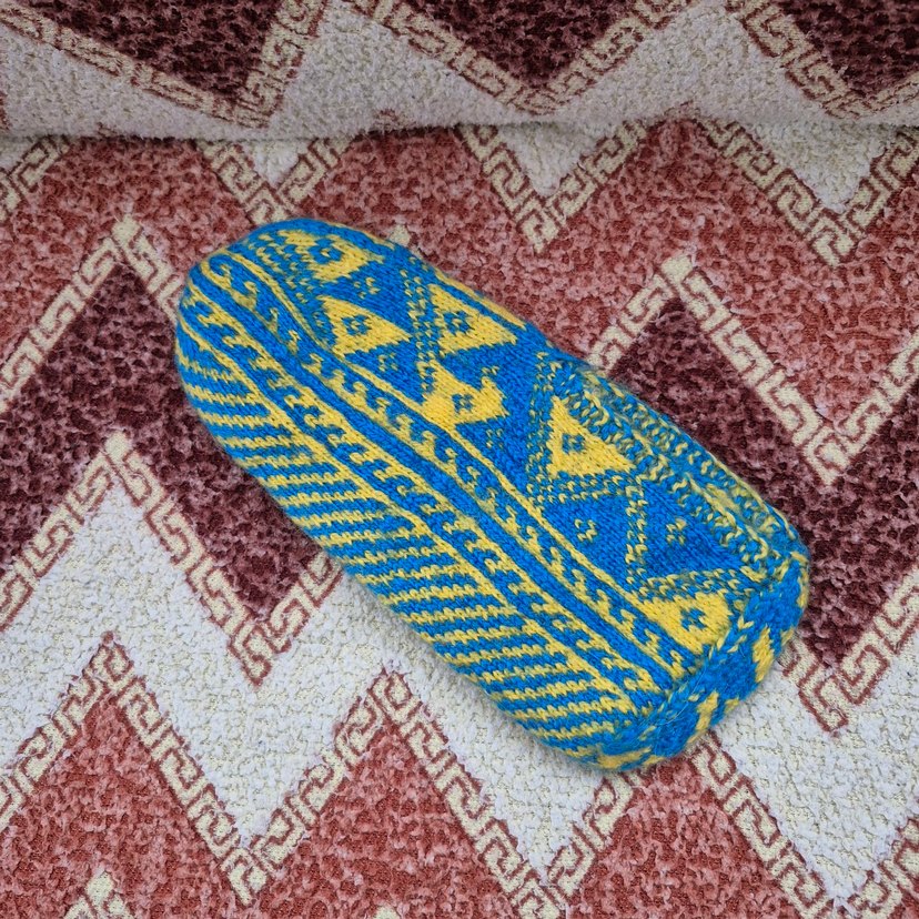 Mavi ve sarı tonlarda renkli desenli geleneksel yün patik. 36-37 uyumlu. Çeyizimin değerli bir parçası.Çeyizimin değerli bir parçası.