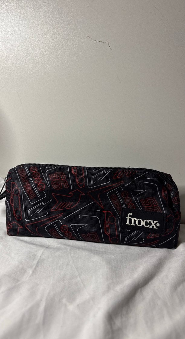 Siyah okul kalemliği renkli desenlere ve fermuarlı kapamaya sahiptir. Önünde 'frocx' markası yazılıdır. ️
