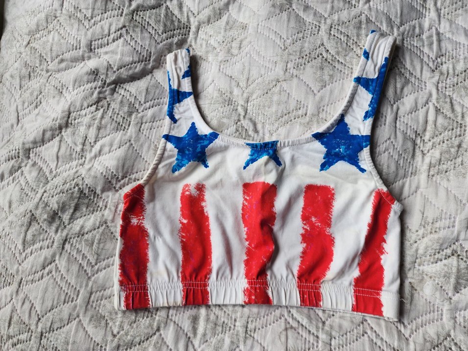 Renkli desenli, beyaz zeminli spor sütyeni, kırmızı çizgiler ve mavi yıldızlar içerir. Athleisure tarzında rahat bir seçenek. ⭐