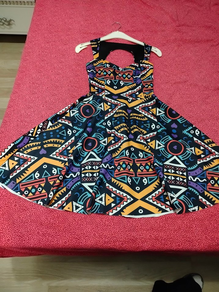 Renkli geometrik desenlere sahip, straplez yakalı ve askılı kollu uzun, vücuda oturan kadın elbisesi. Boncuk detaylarıyla bohem ve retro tarzını yansıtır, parti için uygundur.