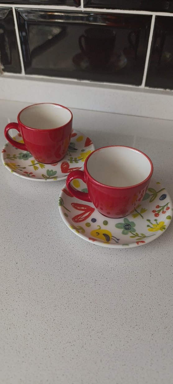 Kırmızı seramik fincanlar, renkli çiçek desenli tabaklarla birlikte sunulmuştur. ☕