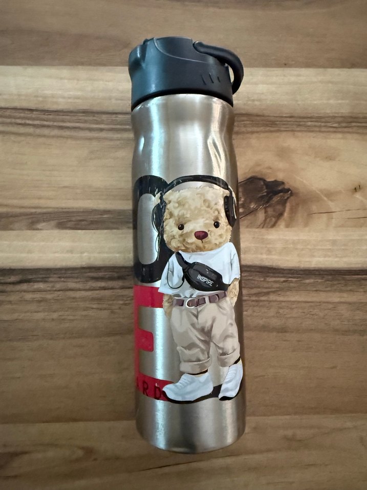 Gri paslanmaz çelikten yapılmış, renkli ayıcık desenli çocuk termos şişesi. Kolay taşınan siyah kapaklıdır.