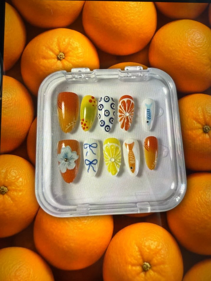 Çiçek, fiyonk ve meyve dilimi desenleri içeren renkli tırnak süsleri. Canlı tırnak tasarımları için uygundur.
