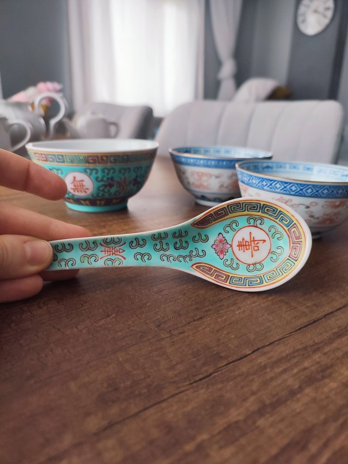 Geleneksel motiflerle süslenmiş renkli desenli turkuaz kase ve uyumlu kaşık seti, servis için uygun. ️