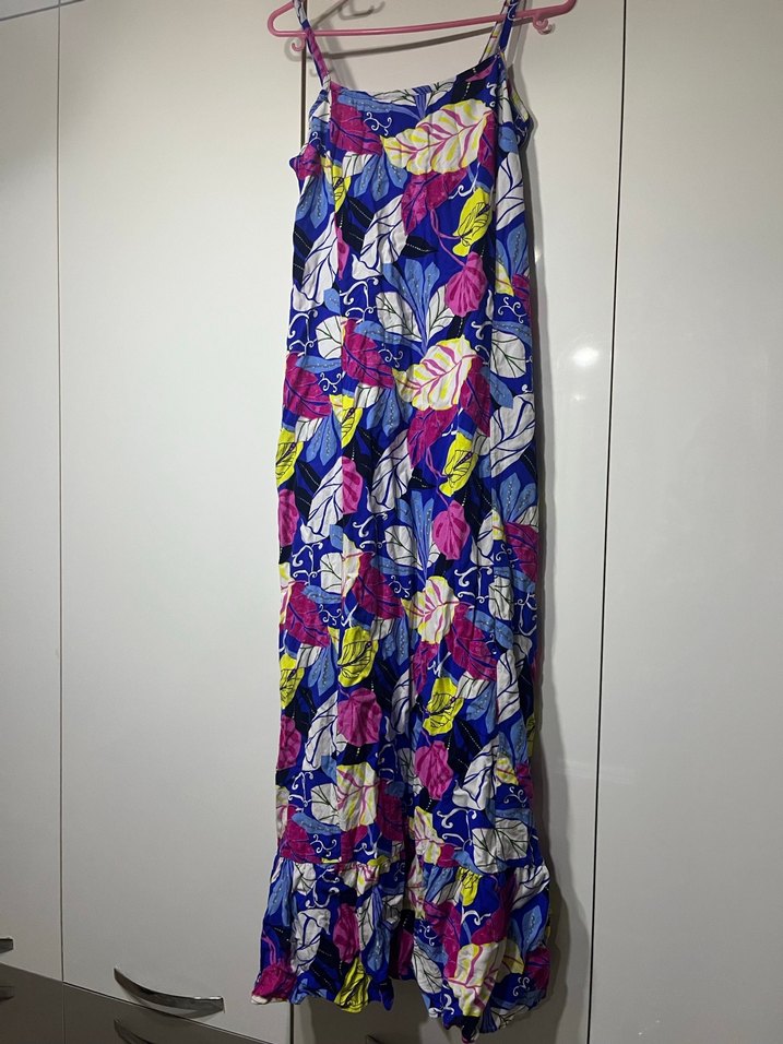 Renkli desenli, pileli detaylara sahip uzun askılı elbise. Straplez yakalı, bol kesim ve yumuşak sentetik kumaştan, bohem tarzını yansıtıyor.