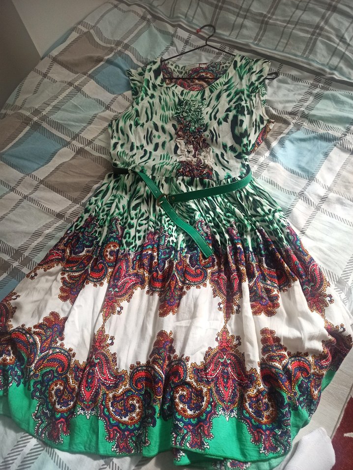Renkli, şal desenli,dökümlü ve bol kesim bohem elbise. Kolsuz ve desenlidir, günlük kullanım için uygundur. yazlik efil efil elbise 40bedendir