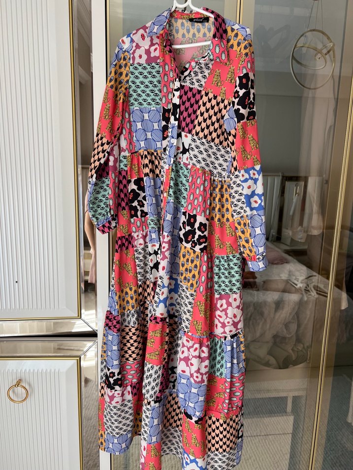 Renkli patchwork desenli, uzun kollu, yakalı ve dökümlü kumaştan bol kesim uzun elbisedir. Günlük kullanıma uygundur.