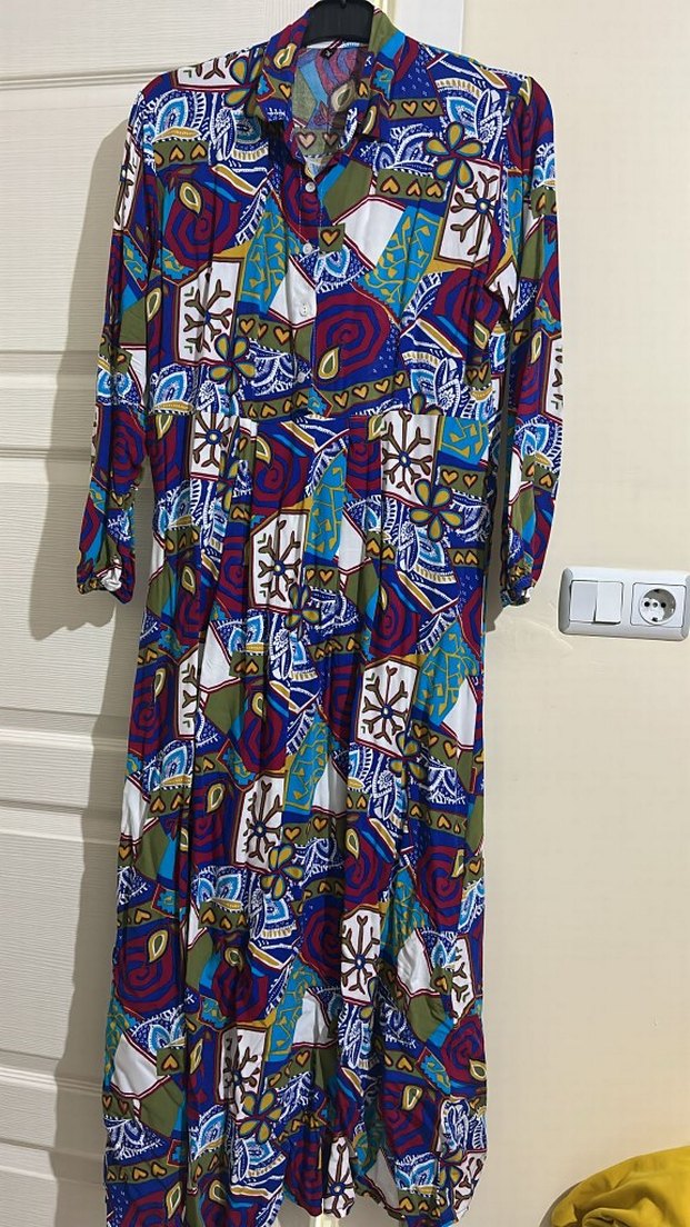 Renkli, desenli uzun ve bol kesim bohem elbise. Yaka ve düğmeli ön kısım, uzun kollu, yumuşak tekstil kumaşından üretilmiştir. Günlük kullanıma uygundur.