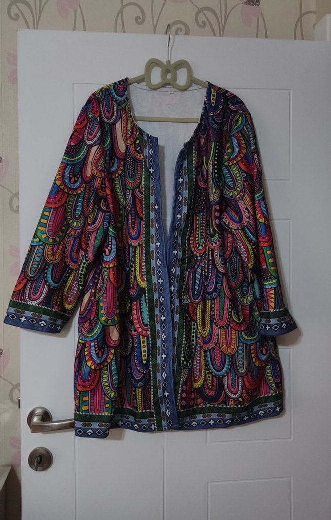 Uzun, renkli desenli bohem tarzı kadın ceket Düğmeli, bol kesim, yaka detaylı ve uzun kollu. Günlük kullanıma uygun.