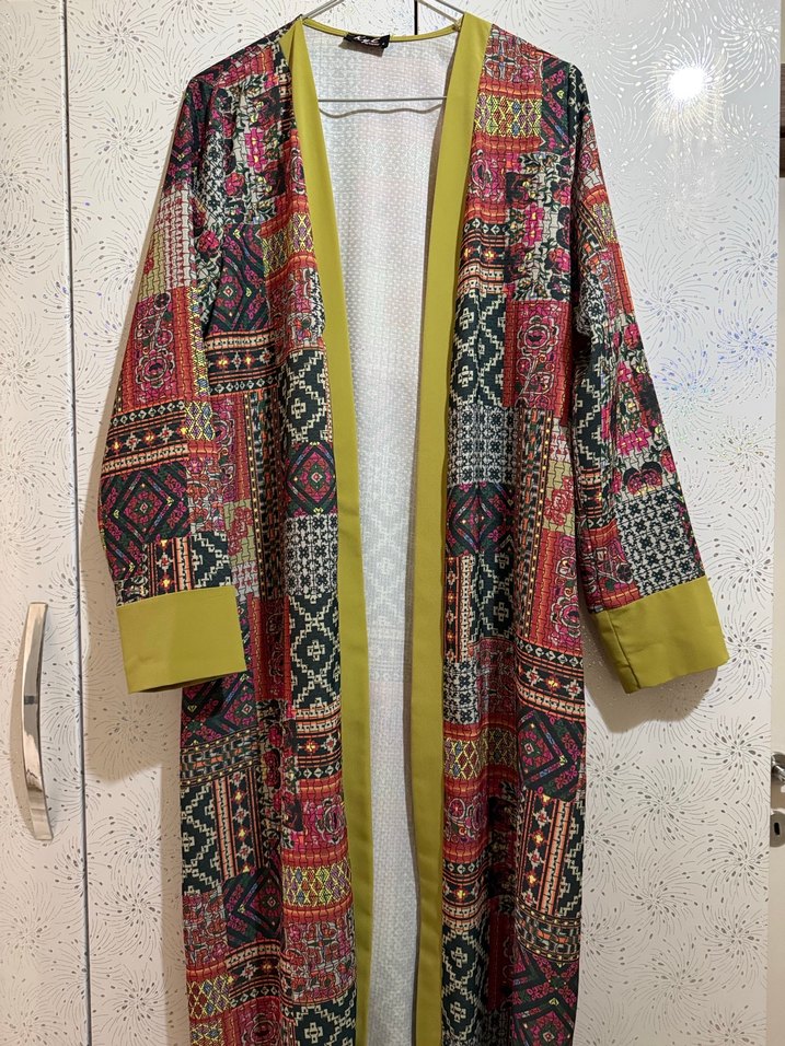 Renkli desenlere sahip, uzun boylu ve bol kesim kadın kimono. Sentetik kumaştan, uzun kollu ve yaka detaylı, bohem tarzda şık bir parça. Püskül hariç Boy 115cm iki koltuk arası 52cm