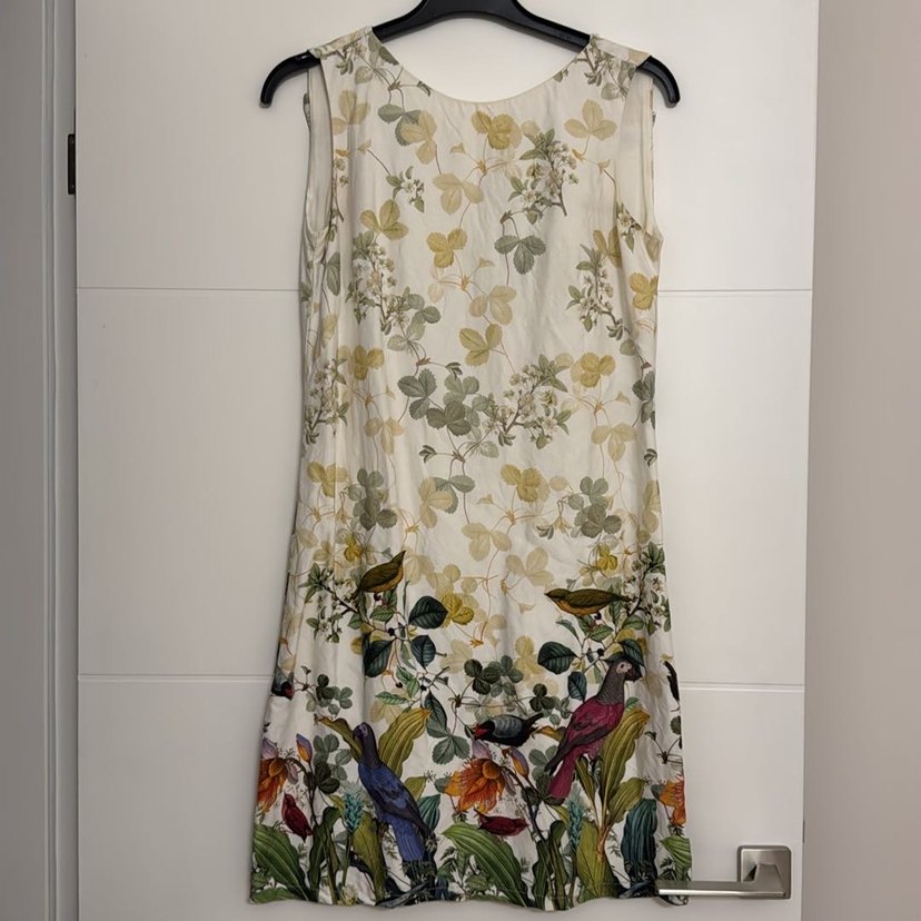 Yuvarlak yaka, kolsuz, bol kesim elbise. Kuş ve çiçek desenli renkli baskıya sahip, yumuşak dokulu kumaştan, günlük kullanım için uygun. Defosuz