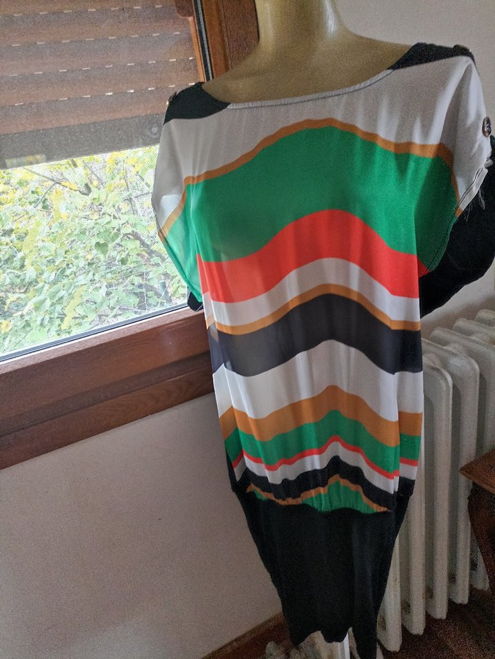 Renkli desenlere sahip, bol kesim kısa kollu ve kayık yaka uzun hamile tuniği. Dökümlü tasarımıyla bohem ve retro tarz sunar, sentetik kumaştan üretilmiştir.