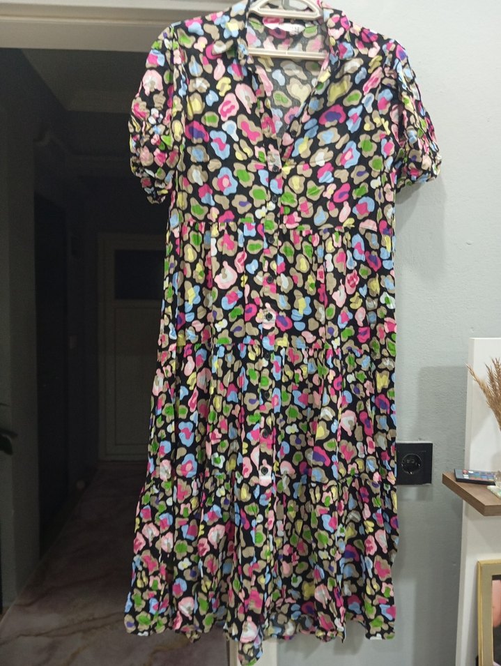 Renkli, uzun, bol kesim kadın elbise. Kısa kollu, V yakalı ve düğmeli ön kısmıyla dikkat çeker. Yumuşak sentetik kumaştan, günlük kullanıma uygun.