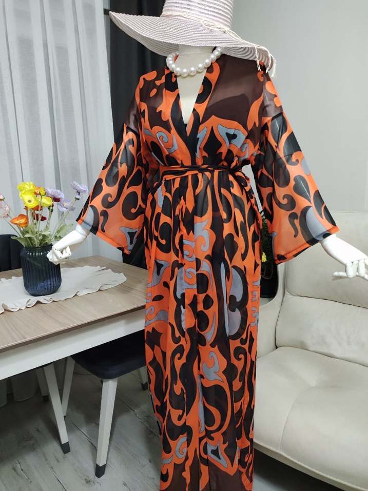 Renkli desenlere sahip, bol kesim ve drapeli uzun kadın kimonosu. V yaka ve uzun kolludur, günlük kullanım için yumuşak sentetik kumaştan üretilmiştir.