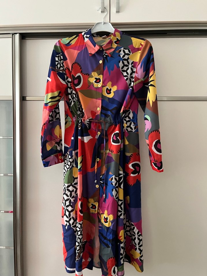 Renkli, desenli uzun elbise, düğmeli ön, yakalı ve uzun kolludur. Bol kesim ve canlı bohem desenlerle günlük kullanıma uygundur.