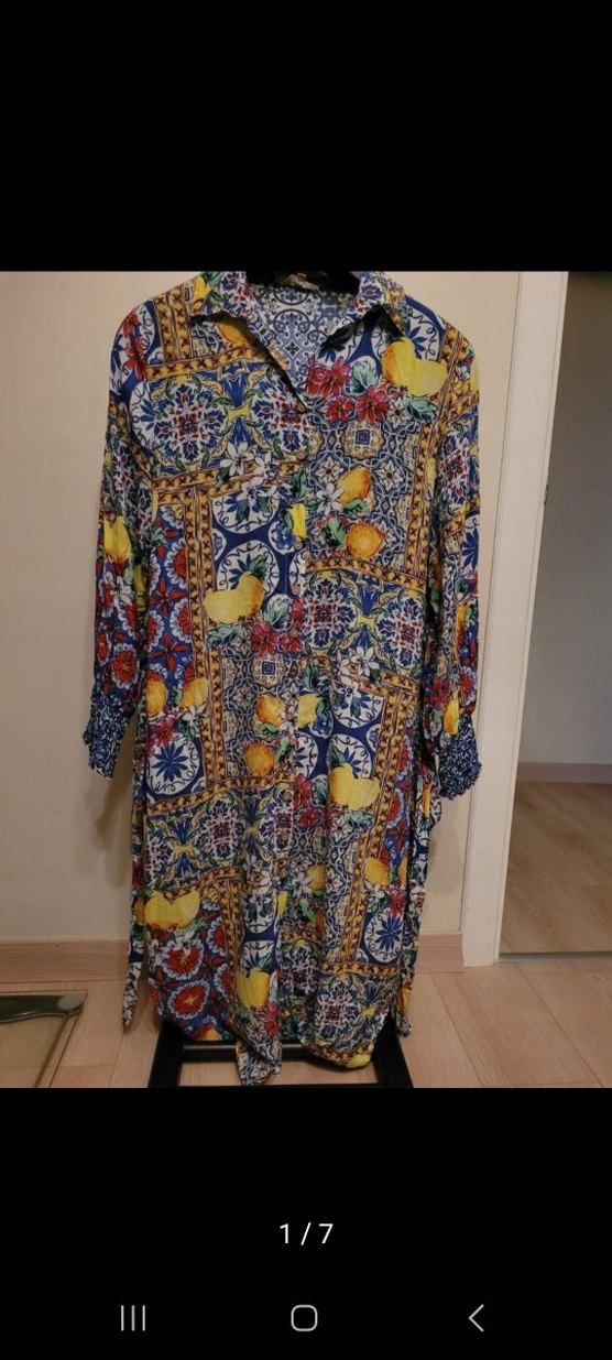 Renkli, uzun kollu bohem elbise, bol kesim ve yakalı. Canlı desenli tekstilden ve düğmeli öne sahip.