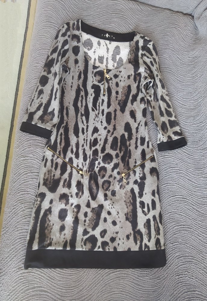 Uzun kollu fermuar cepli ve bol kesim kadın elbisesi. V yaka ve altın renkli fermuar detaylarıyla çağdaş bir tasarım sunar.