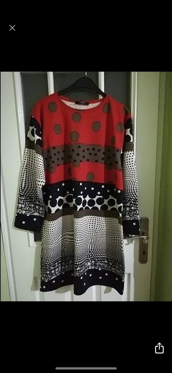 Uzun kollu, bol kesim, yuvarlak yakalı, örme dokulu ve renkli desenli rahat kadın elbise