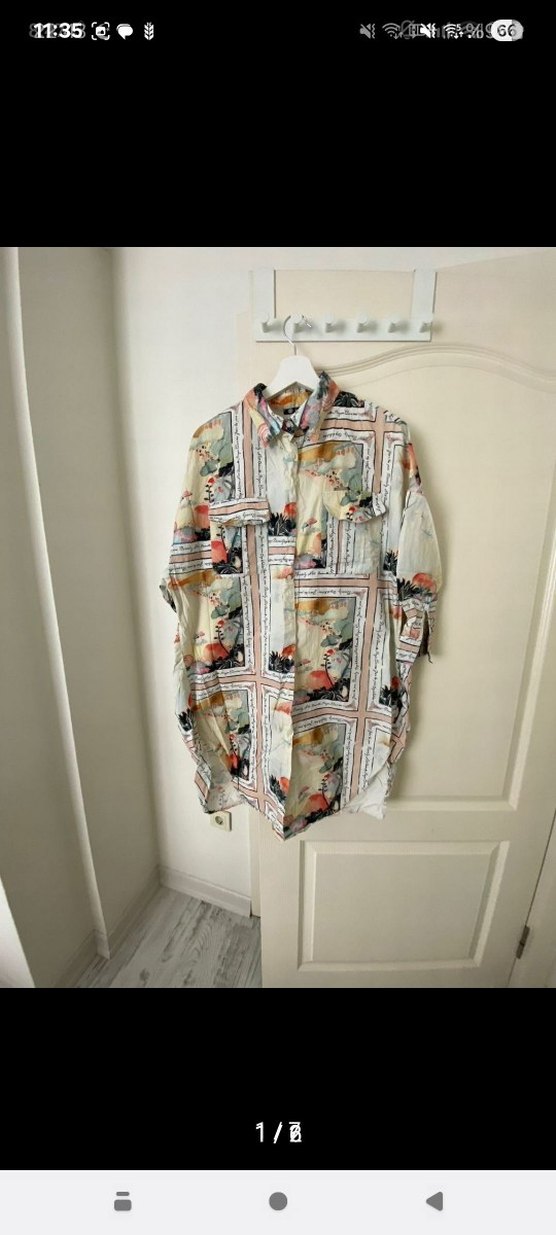Kadınlar için uzun kesim, kısa kollu, düğmeli ve yakalı gömlek. Pastel renklerde batik desenli, bohem ve vintage tarzda, yumuşak dokulu kumaştan yapılmıştır. l xl olur geniş kesim