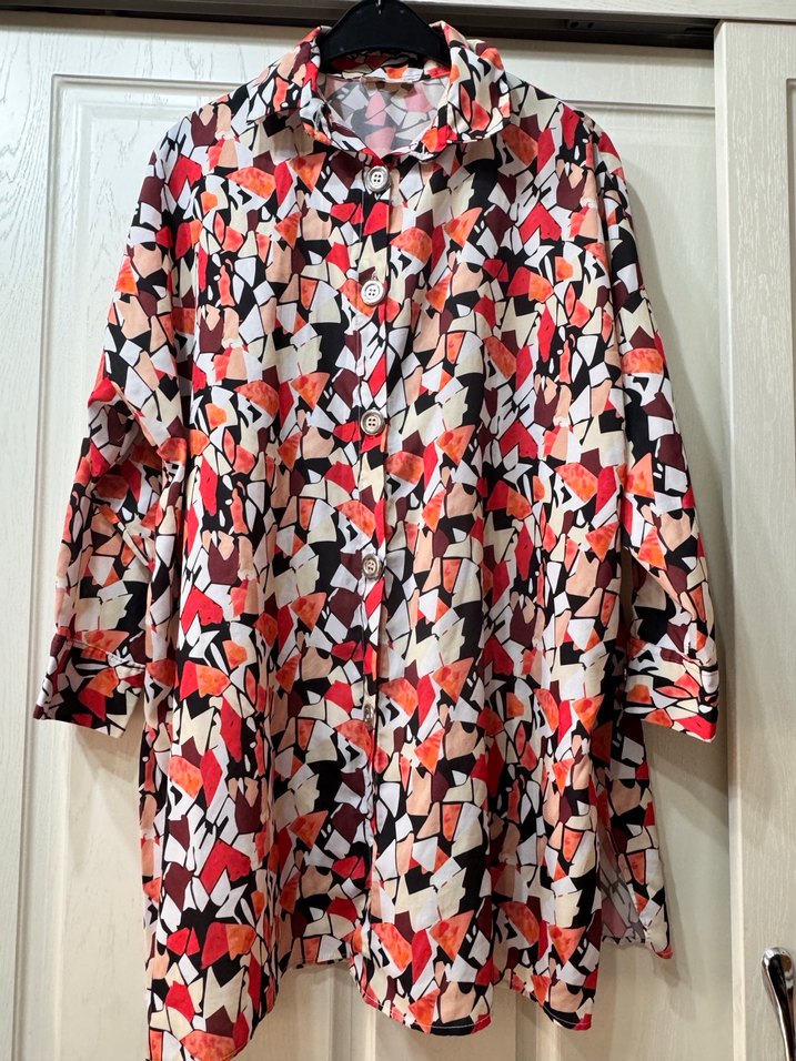 Renkli desenli, uzun kollu, düğmeli ve bol kesim kadın gömleği. Bohem ve retro tarzıyla günlük kullanıma uygundur.
