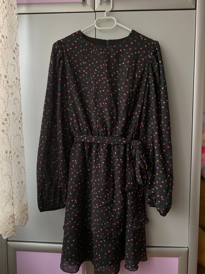 Renkli desenli, uzun kollu, bol kesim midi elbise. Koyu sentetik kumaştan, fırfır detaylı ve bel bağlamalıdır.