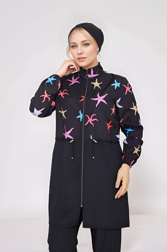 Renkli batik desenli, uzun ve bol kesim siyah haşema. Fermuarlı önü, uzun kolları ve yaka detaylarıyla sentetik kumaş#haşema#yaz#