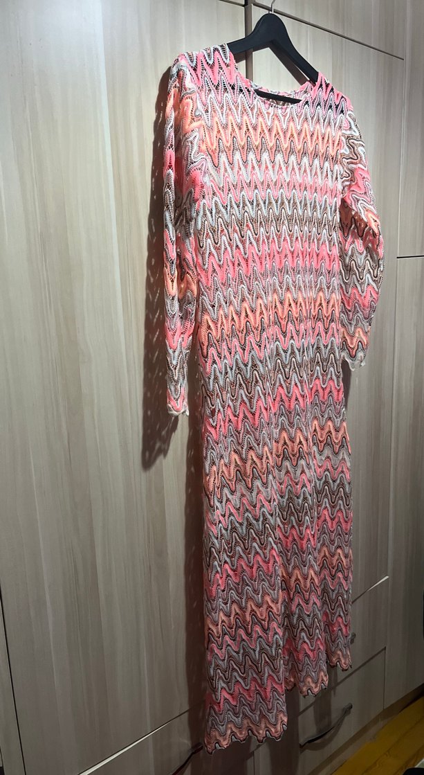 Renkli desenli, uzun triko elbise. V yaka, bol kesim ve uzun kollu, bohem tarzda günlük kullanım için uygundur. Ürün boy 129 iki kol arası 52 cm