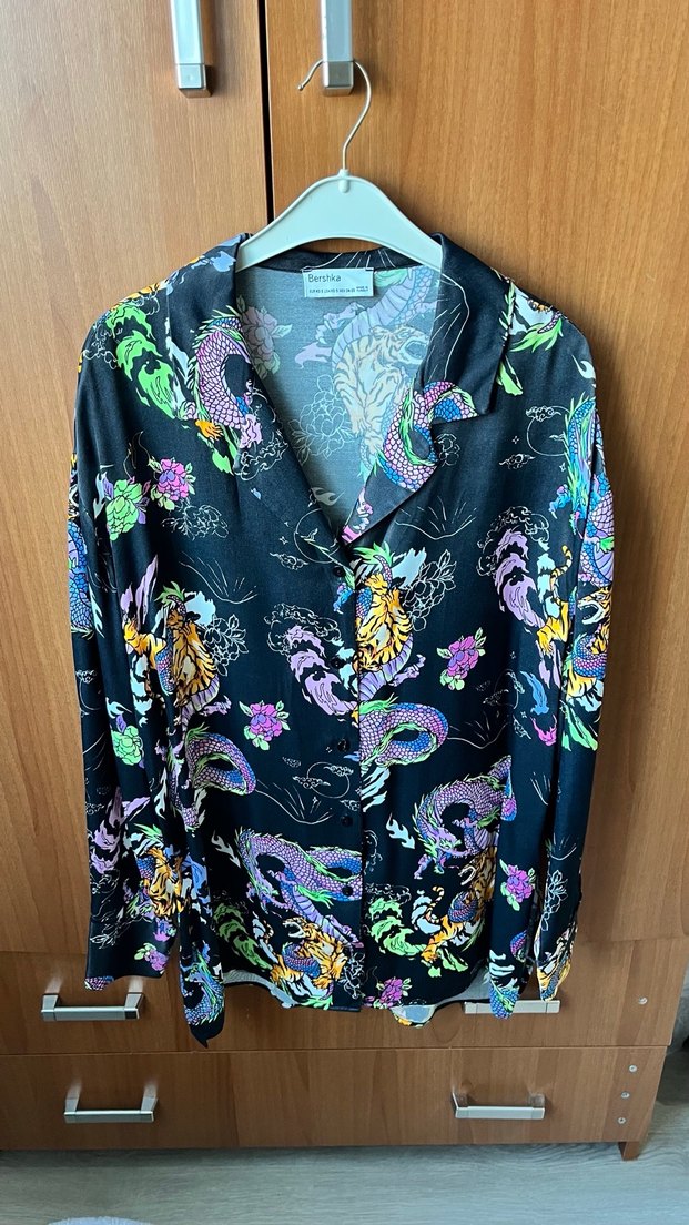 Kadın gömlek, bol kesim, uzun kollu ve V yakalıdır. İpeksi bir kumaşı var bir kere giyildi. Oversize model