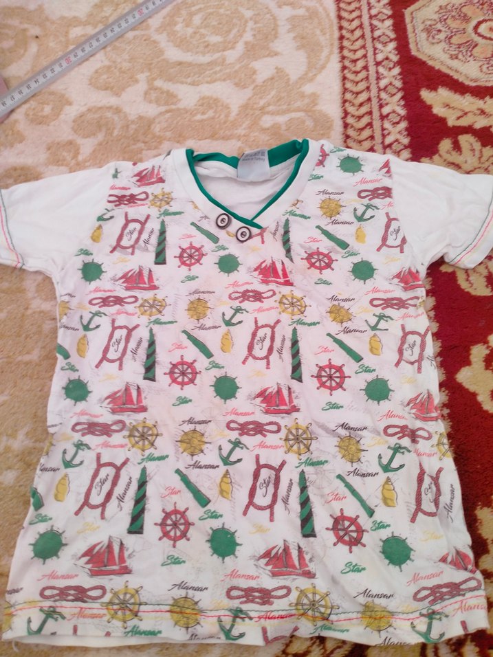 Renkli deniz temalı desenlere sahip, düğmeli V yakalı, kısa kollu, bol kesim kız tişörtü. Yumuşak tekstil kumaştan, rahat ve şık. ⚓