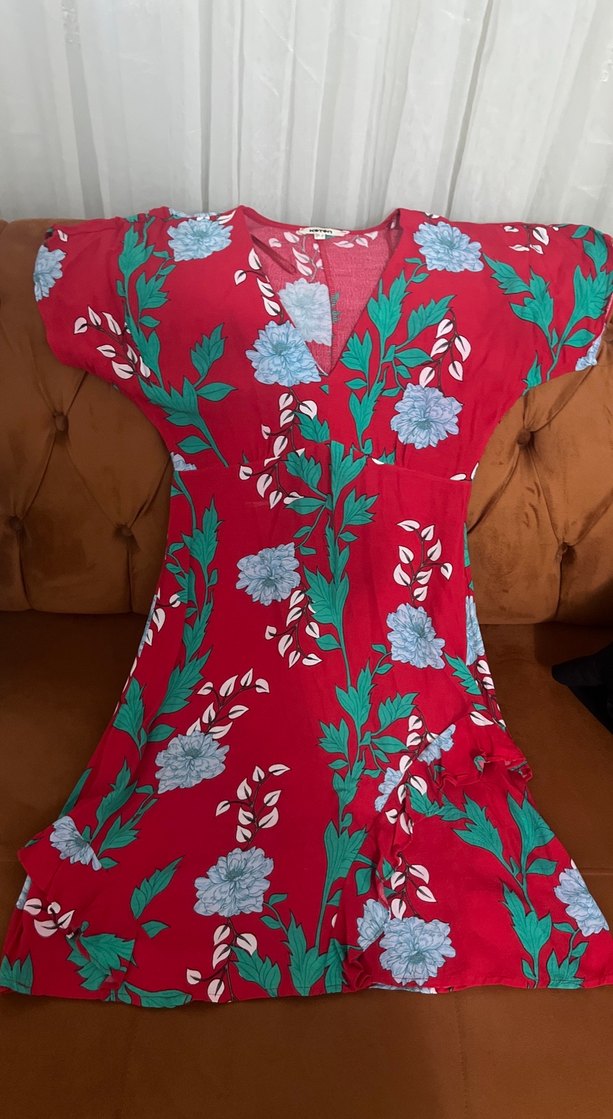 Renkli desenli, V yakalı ve kısa kollu bu bohem elbise sentetik kumaştan olup, drapeli ve vücuda oturan kesimdedir.