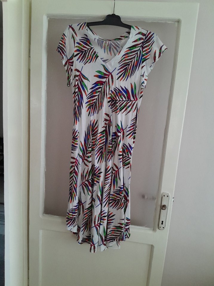 Renkli desenli, v yaka ve kısa kollu uzun elbise. Rahat kesim ve dökümlü tasarıma sahip, yumuşak sentetik kumaftan yapılmıştır.