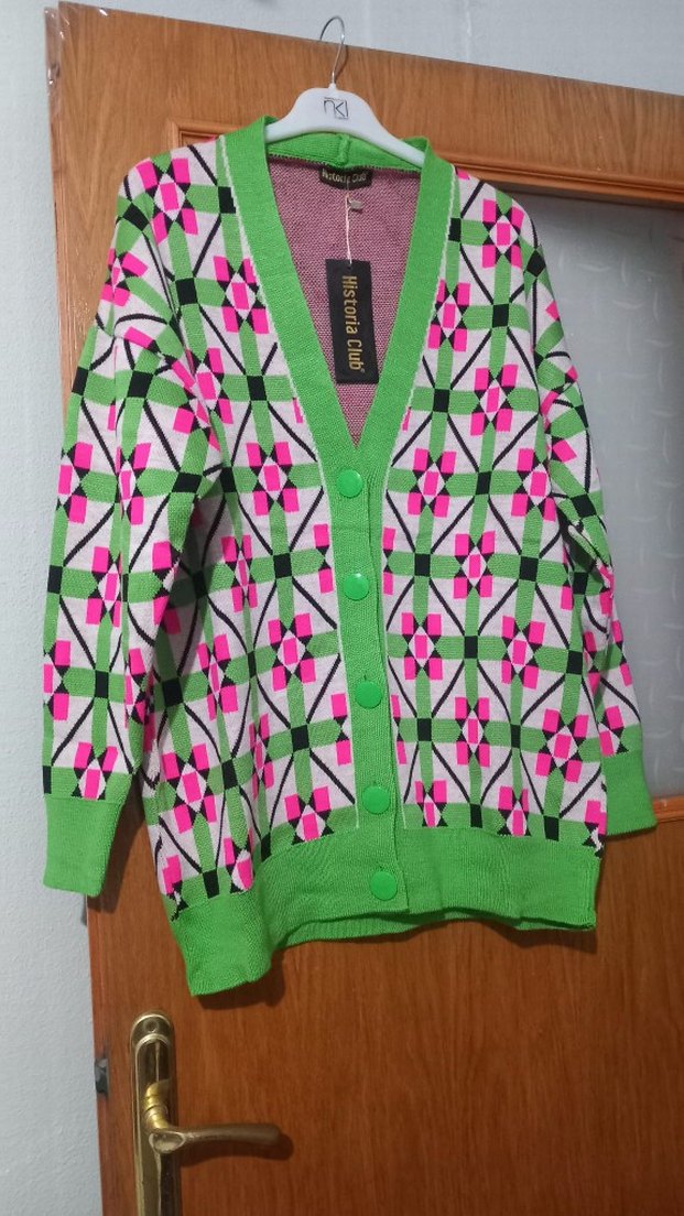 Renkli geometrik desenli, V yakalı, uzun kollu, bol kesim ve mini uzunlukta örme kadın hırkası. Rahat ve bohem tarz için uygundur. 36 38 bedene uyumlu