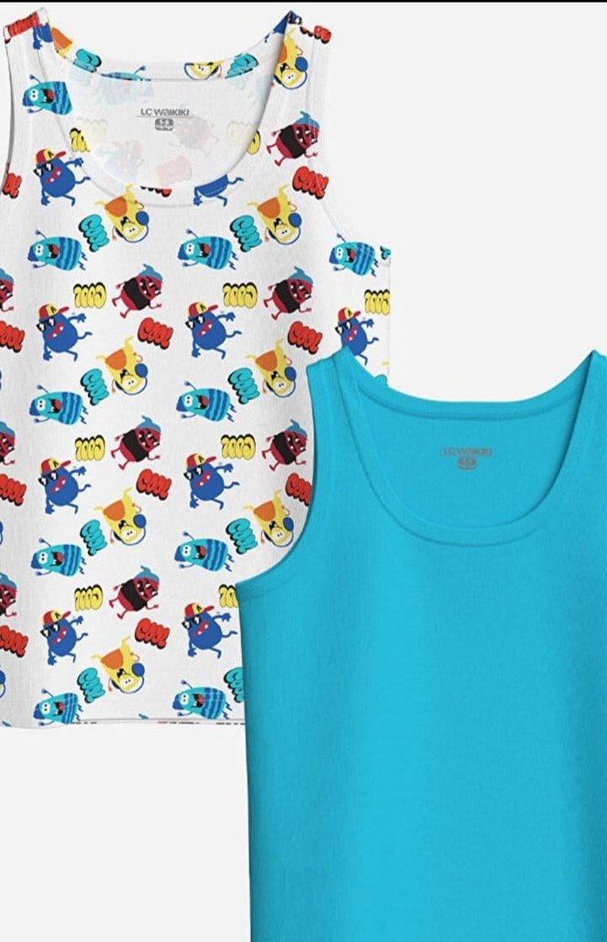 Renkli desenli karakterler ve düz mavi olmak üzere iki erkek çocuk atleti, yumuşak kumaştan yapılmıştır.