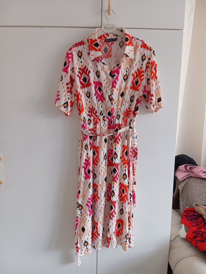 renkli Viskon kumaş yarıya kadar Düğmeli kısa kollu ara boy elbise yepyenidir çok güzeldir