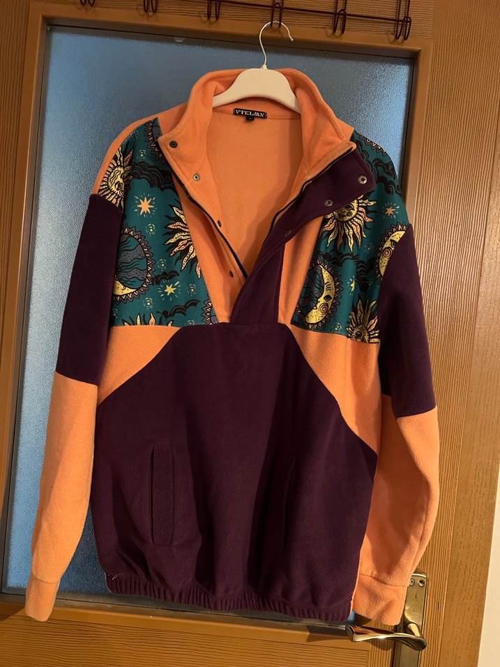 Yarım fermuarlı, yüksek yakalı, bol kesim polar Çok renkli baskılı desenleriyle günlük sokak stiline uygun. Sadece 1 kez giyildi.