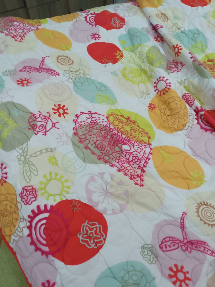 Renkli desenlerle süslenmiş, yumuşak sentetik kumaştan yapılmış tek kişilik yatak örtüsü