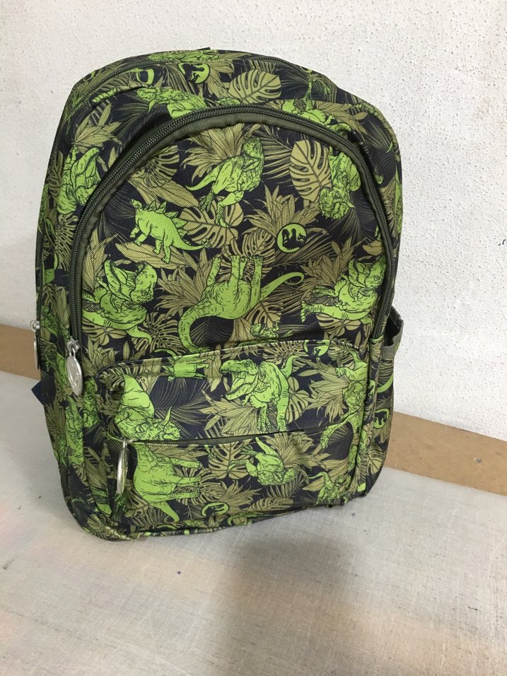 İki bölmeli önde küçük bi cep Çok bölmeli fermuarlı, canlı yaprak ve dinozor desenli renkli yeşil çocuk okul çantası.