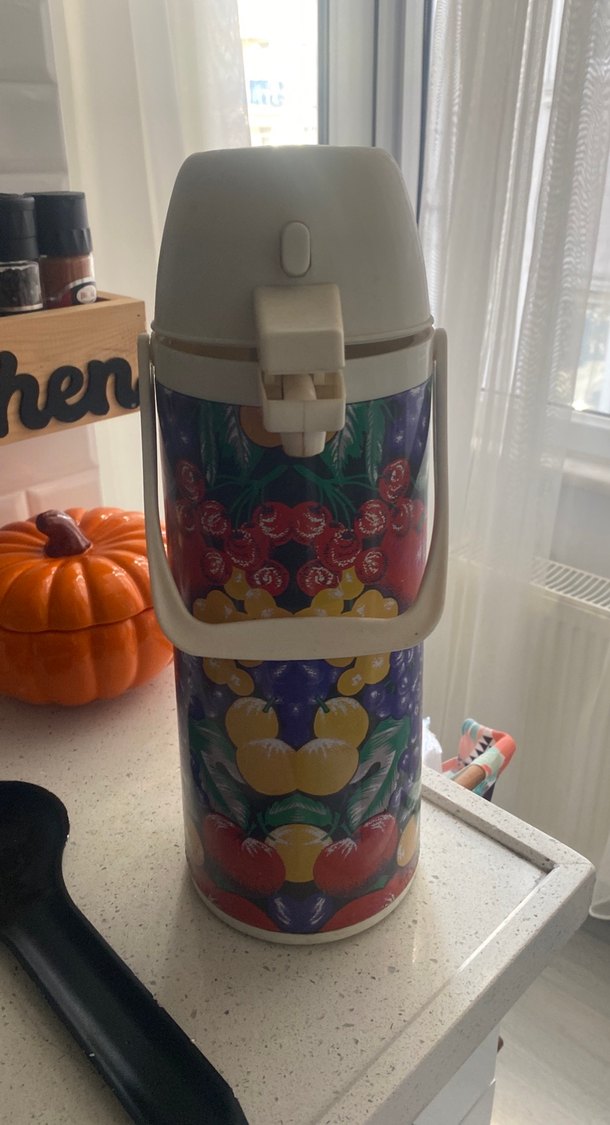 Canlı meyve desenli, beyaz kapaklı ve taşıma saplı renkli yetişkin termosu.