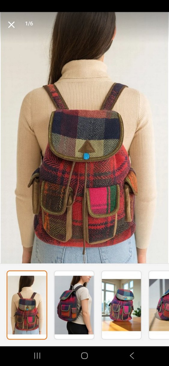 Kadınlar için yün kumaştan yapılmış, renkli desenli sırt çantası. Çoklu tokalı cepleri ve ayarlanabilir askıları vardır, günlük kullanım için uygundur.