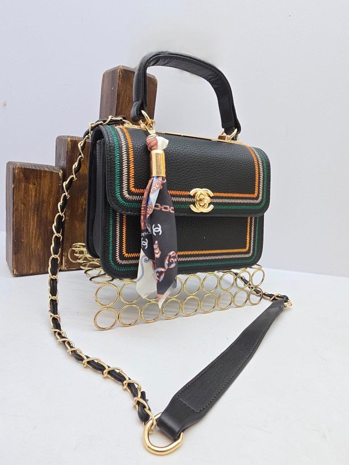 Deri malzemeden yapılmış, renkli desenli ve zincir detaylı kadın çantası. Modern klasik ve Parisian stilini yansıtır, gündelik kullanıma uygundur.