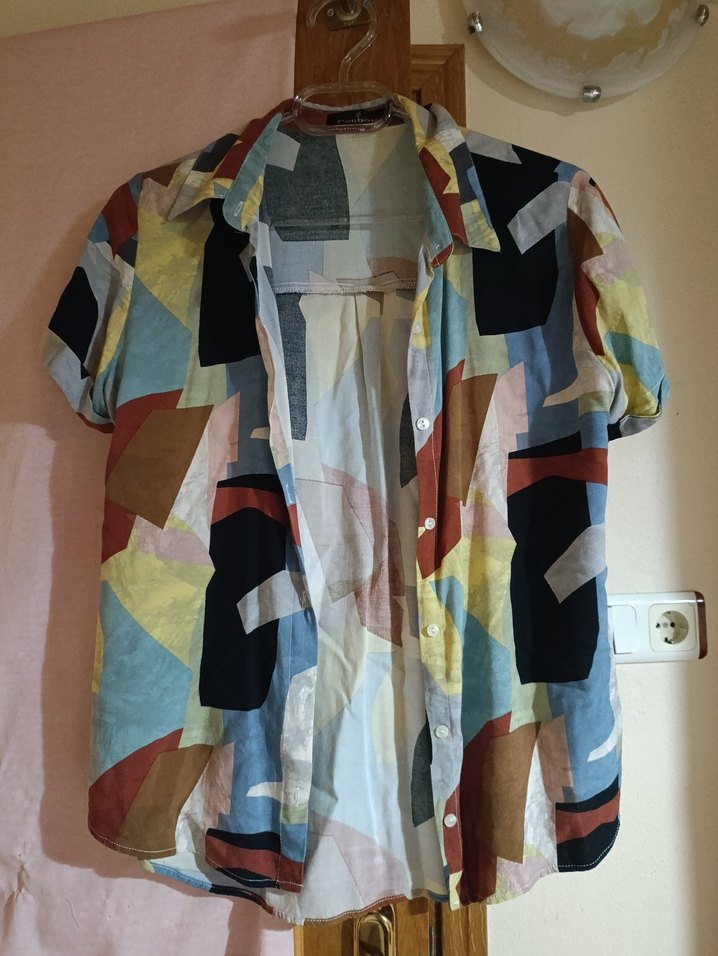 Renkli, desensiz, kısa kollu kadın gömleği. Düğmeli ve yakalı, bol kesim. Günlük kullanıma uygun hafif tekstil kumaştan üretilmiştir.