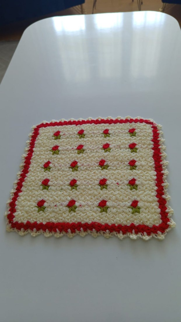Yumuşak dokulu beyaz banyo süngeri, renkli kırmızı ve yeşil detaylarla süslenmiştir.