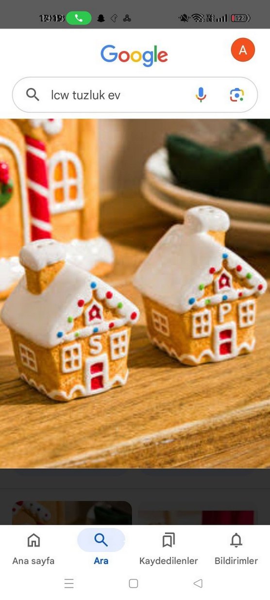 Renkli detaylarla süslenmiş, beyaz çatılı küçük ev figürleri. Kırmızı kapı ve renkli noktalar bulunur. tuzluk