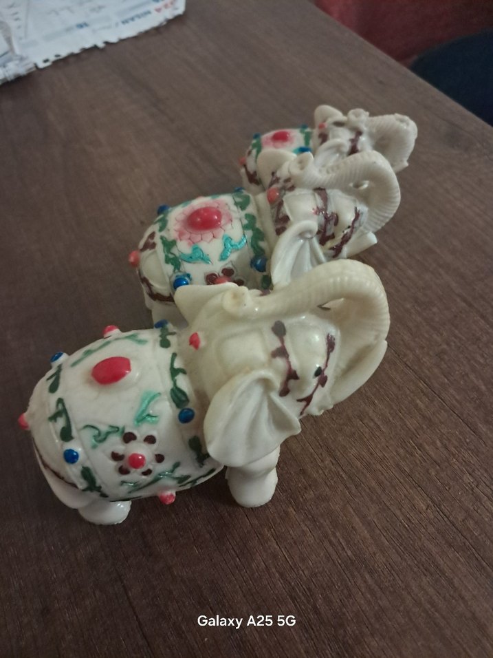 Renkli detaylara sahip beyaz fil figürleri, ince desenler ve canlı süslemeler içerir.