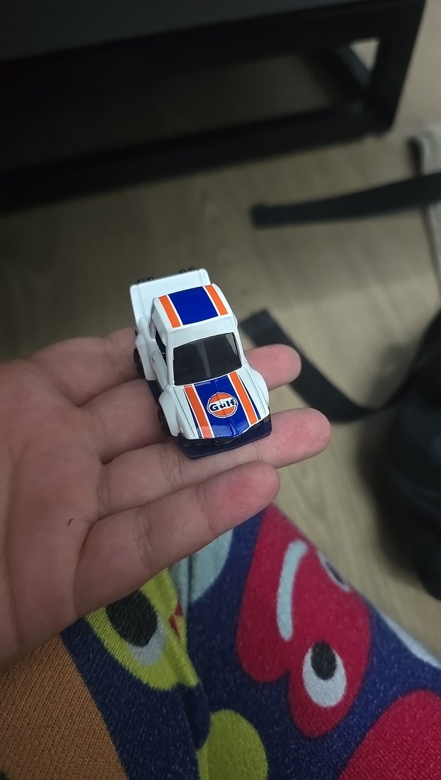 Bu küçük oyuncak araba, kaputunda renkli yarış çizgileri ve Gulf logosu bulunan beyaz renktedir. Elinizde rahatça tutulabilir.
