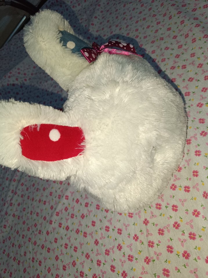 Yumuşak kumaştan yapılmış, renkli detaylara ve süslü kurdeleye sahip beyaz peluş oyuncak.