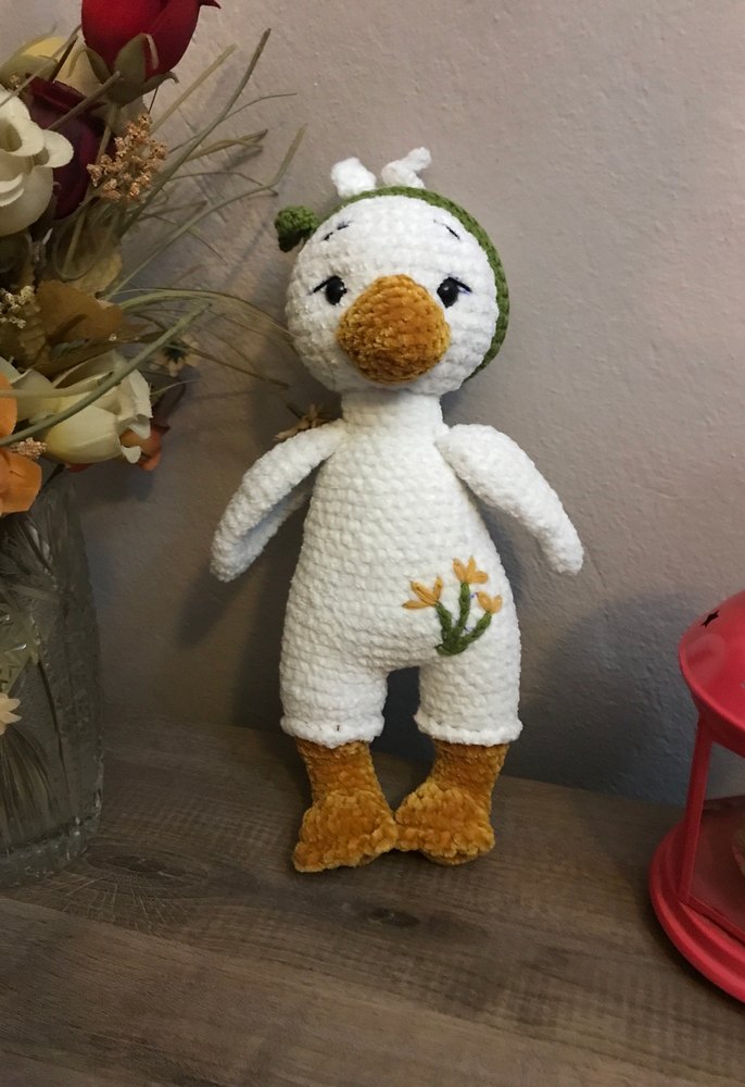 Yumuşak kumaştan yapılmış beyaz peluş oyuncak ördek, renkli detaylar ve nakışlı çiçek süslemeleriyle dikkat çekiyor.