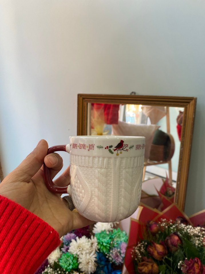 Kabartmalı dokulu, renkli detaylı beyaz seramik kupa, kenarında 'E-VE-JOY' yazısı bulunur. ☕