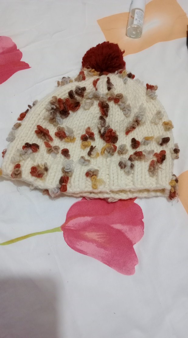 Örgü yapıda, renkli dokulu detaylar ve üstte ponpon bulunan, bohem tarzına uygun kadın bere.